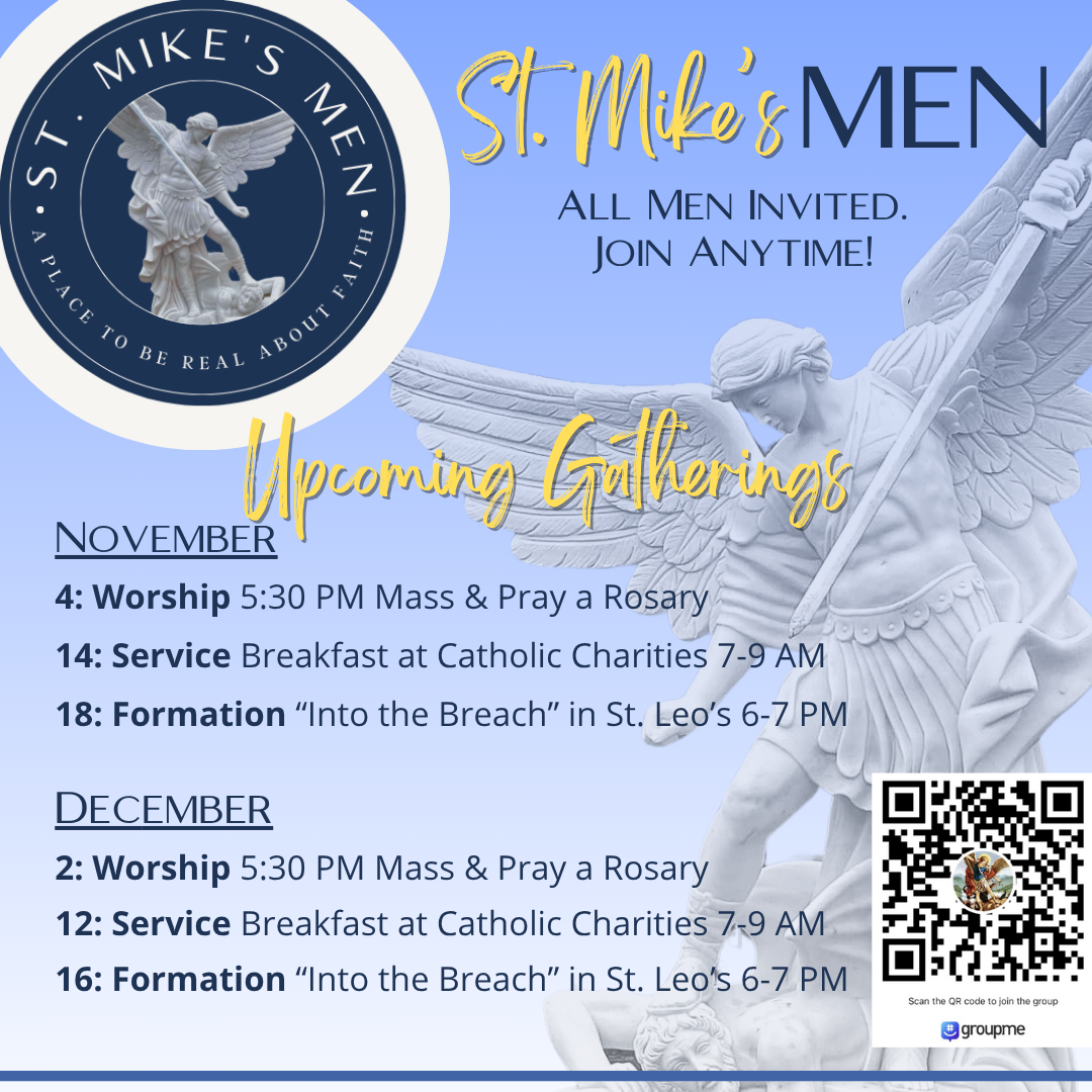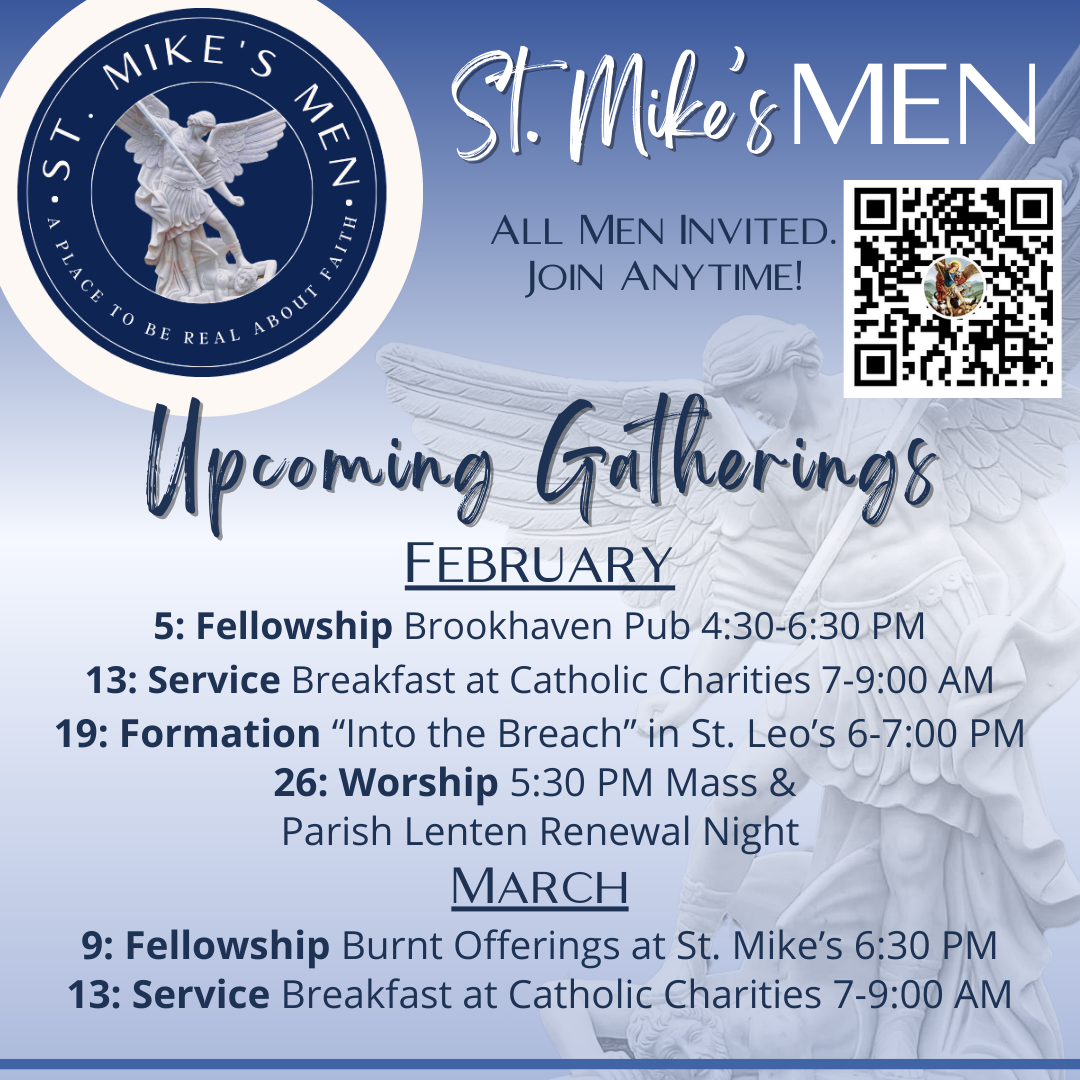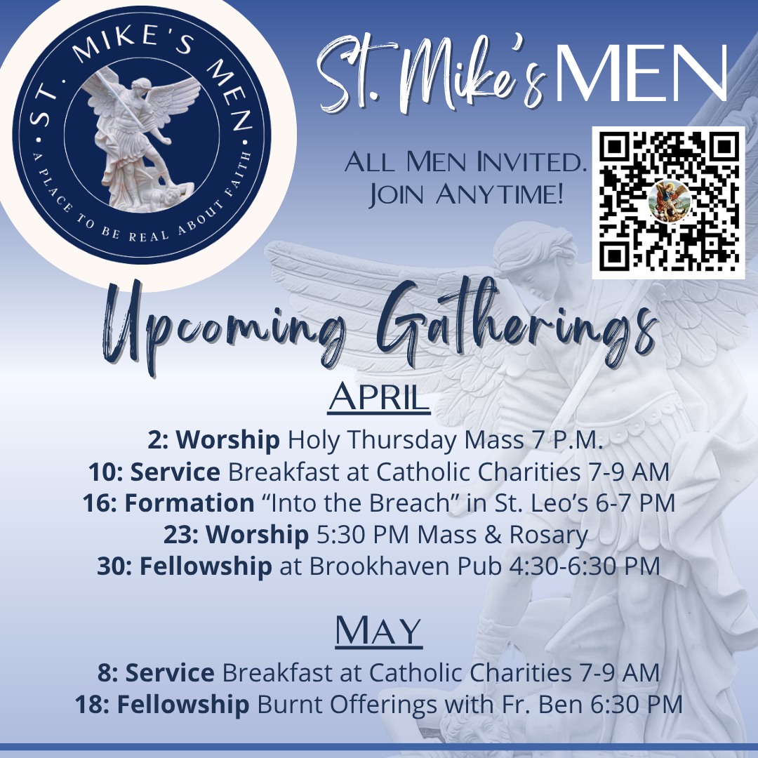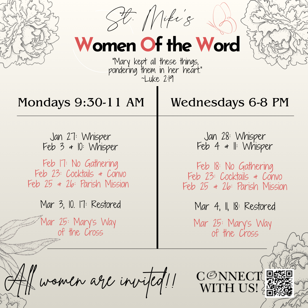 See below for the many options St. Michael's offers to learn more about the Faith and deepen your relationship with Christ and each other! Contact Khira Rotty for more information.