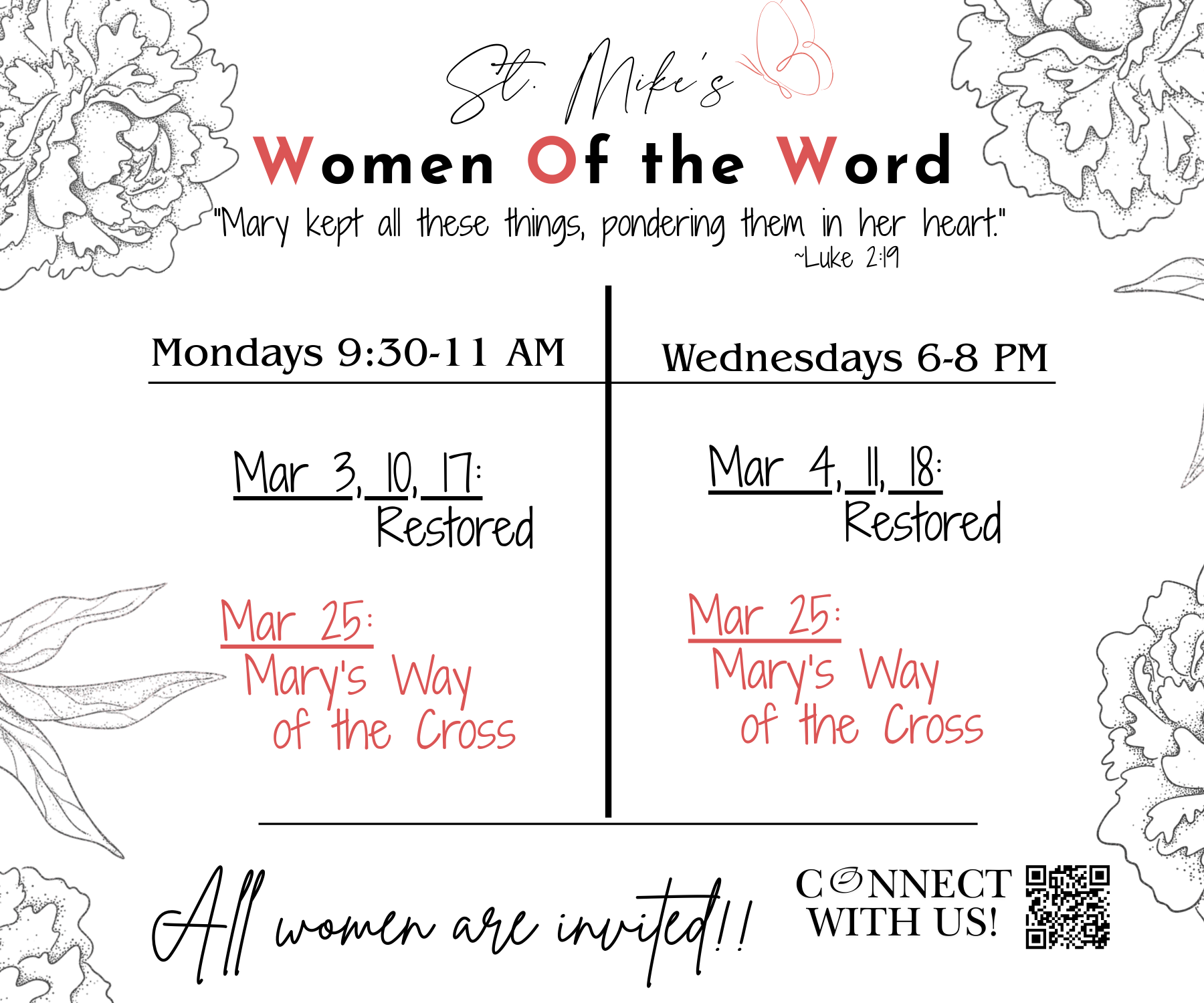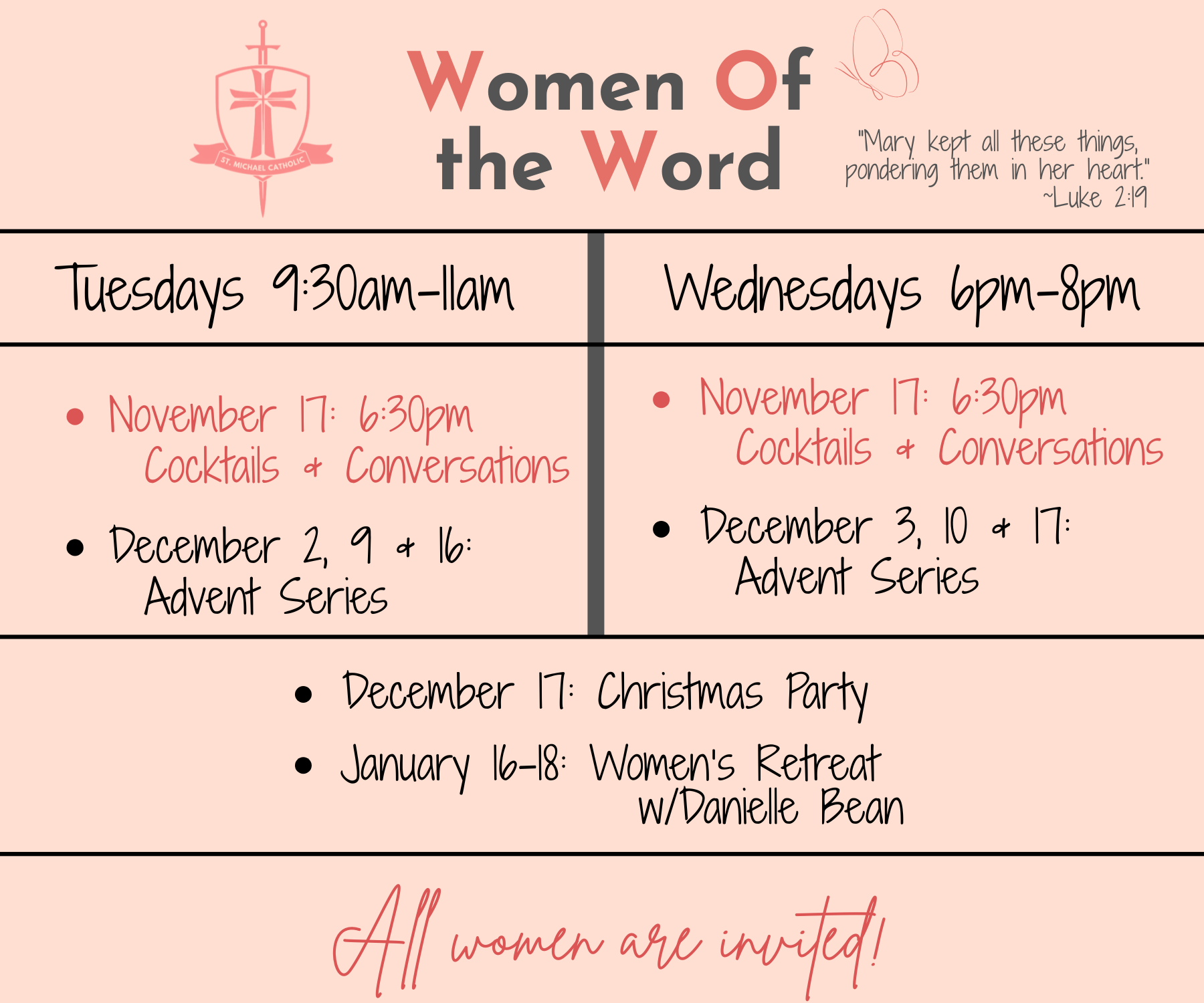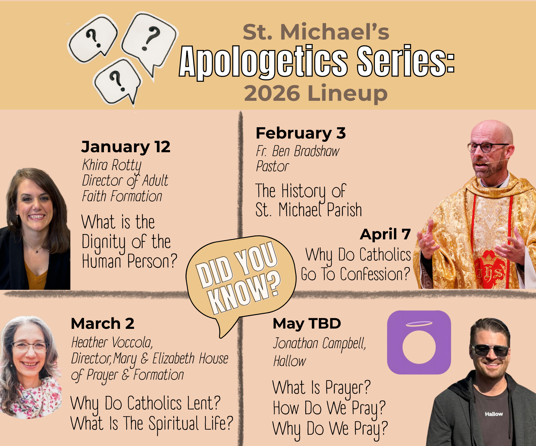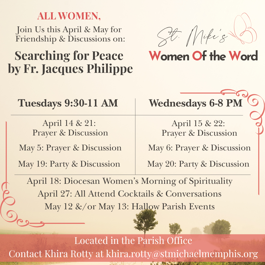 See below for the many options St. Michael's offers to learn more about the Faith and deepen your relationship with Christ and each other! Contact Khira Rotty for more information.
